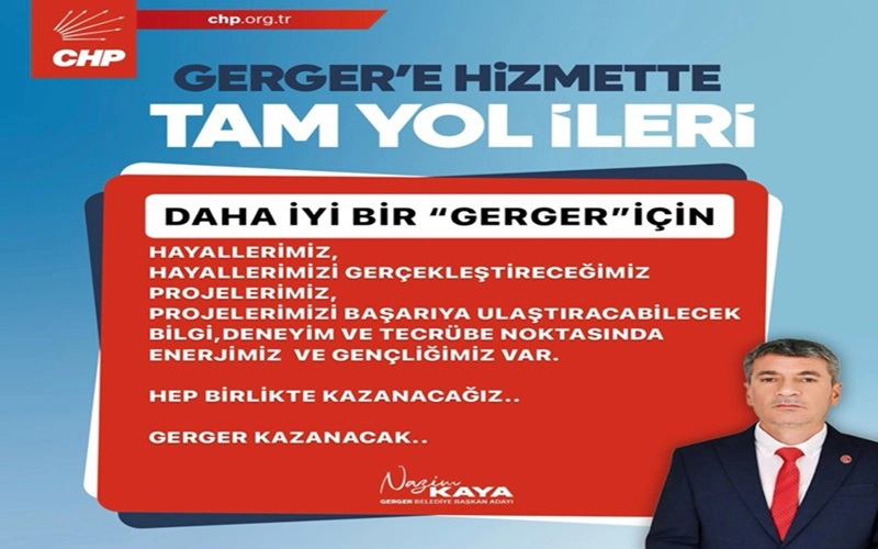 Gerger ilçesinin şimdiye kadar beklediği hizmetleri alamadığını belirten CHP Gerger Belediye Başkan adayı Nazim Kaya; “Hayallerimiz, hayallerimizi gerçekleştireceğimizi projelerimiz, projelerimizi başarıya ulaştırabilecek bilgi, deneyim ve tecrübe noktasında enerjimiz ve gençliğimiz var. Hep birlikte kazanacağız. Haliyle Gerger kazanacak.
